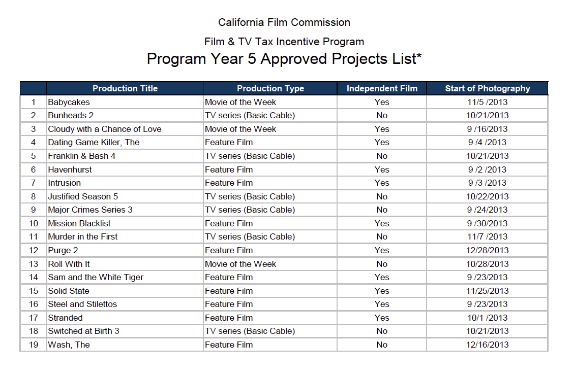Sob este programa, a produção deve gravar 75% dos seus dias na Califórnia, ou gastar 75% do seu orçamento de produção na Califórnia.